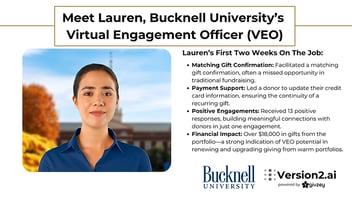 Donors are engaging directly with the VEO to share stories about why they choose to give and how the organization has impacted their lives. They’re asking for information on event registration, organization initiatives, and past giving. They’re sharing feelings of gratitude and appreciation for the personal messages the VEO sends. Through these connections, the VEO learns about donors as a human gift officer would, enabling personalized interactions that drive increased giving, planned gift opportunities, and pipeline development.