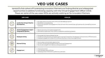 One of our innovation partners saw a 10-year gap in its annual giving program, when it was sunset by past leadership. They are using the VEO to focus on alumni who graduated during this “lost generation”. Another recognized that engagement opportunities with alumni outside the geographic region of their campus were much more limited, and used the VEO to begin and restart those engagements.