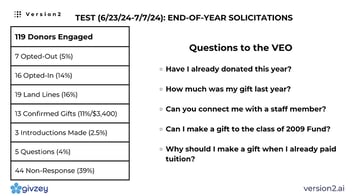 Personalizing asks ensure donor trust and demonstrates you know them as individuals. Whether upgrading gifts, identifying matching opportunities, or guiding them through estate planning, VEOs recognize patterns in donors’ past giving and learn from two-way conversations, adapting to each donor’s preferences. As a result, the VEO projects to raise $200,000 by the end of the year.