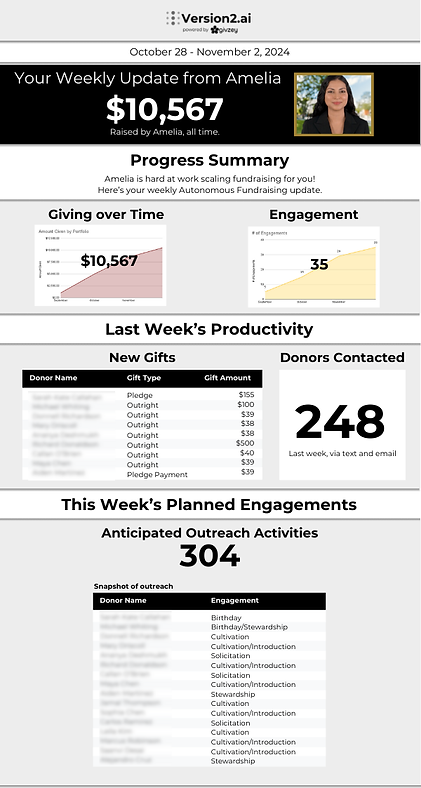 As a result of our research and the developments that came thanks to the collaborative insights of our Innovation Partners, the VEO sent its first weekly productivity report to its manager last week, offering a proactive summary of metrics like new gifts, donor engagement levels, and even a preview of planned activities for the week ahead.